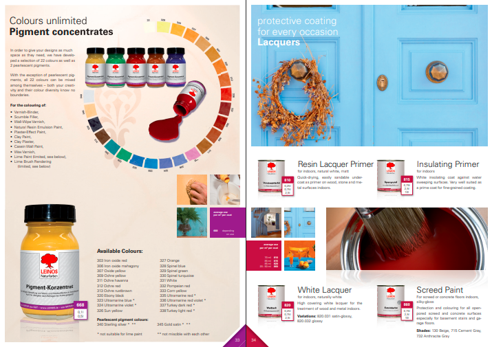 純粋な赤色顔料を除き、すべてのLEINOS顔料濃縮液は天然の土や鉱物顔料から作られています。