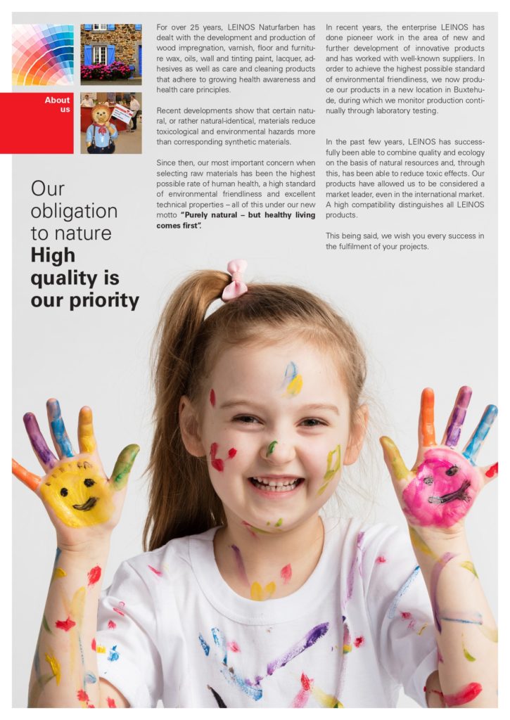25年以上にわたり、LEINOS Naturfarbenは木材含浸剤、ワニス、床・家具用ワックス、オイル、壁用塗料・着色塗料、ラッカー、接着剤、ならびに健康意識の高まりと健康管理の原則に沿ったケア・クリーニング製品の開発と製造に取り組んできました。